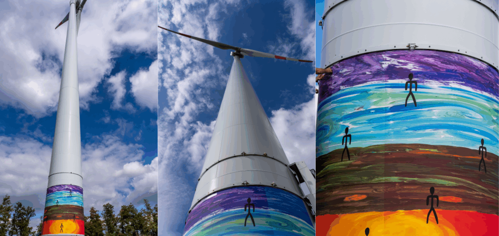 Questa era la prima volta in cui si cimentavano in un lavoro diverso, non da dipingere sui muri come negli altri casi, ma da stampare come grande adesivo per decorare una turbina eolica. A tale scopo hanno realizzato quattro bozzetti su una pala eolica in miniatura in cartone per poi scegliere il disegno finale insieme a ènostra.