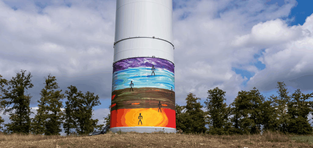 Aria, acqua, terra e fuoco: i quattro elementi della Terra sono il soggetto del disegno della nuova decorazione della turbina eolica collettiva di ènostra nella località Castiglione a Gubbio. Affisso il 13 ottobre 2025 come stampa adesiva, il dipinto è il frutto del lavoro condotto dai giovani del laboratorio MuralEspressivo.