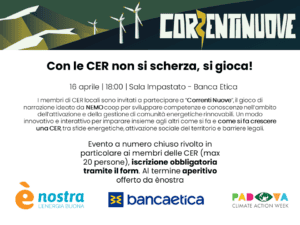 Giovedì 16 aprile dalle 18 alle 21 presso Sala Impastato nella sede di Banca Etica (Via Niccolò Tommaseo 7, Padova), in occasione della Padova Climate Action Week di cui ènostra è partner, si terrà l’evento organizzato in collaborazione con Banca Etica e NEMO coop Con le CER non si scherza, si gioca!