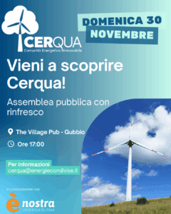 La Comunità Energetica Rinnovabile CERqua invita cittadini, giornalisti, enti pubblici, associazioni e imprese a partecipare all’assemblea pubblica di domenica 30 novembre, alle 17:00, presso il pub The Village in Piazza Quaranta Martiri 29, Gubbio.