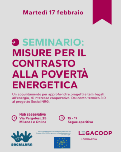 L’iniziativa, promossa da Legacoop Lombardia, nell’ambito del progetto europeo Life SOCIALNRG, si terrà martedì 17 febbraio dalle ore 15:00 alle 17:00 e potrà essere seguita sia in presenza presso l’Hub Cooperativo in via Pergolesi 25 a Milano, sia online.
